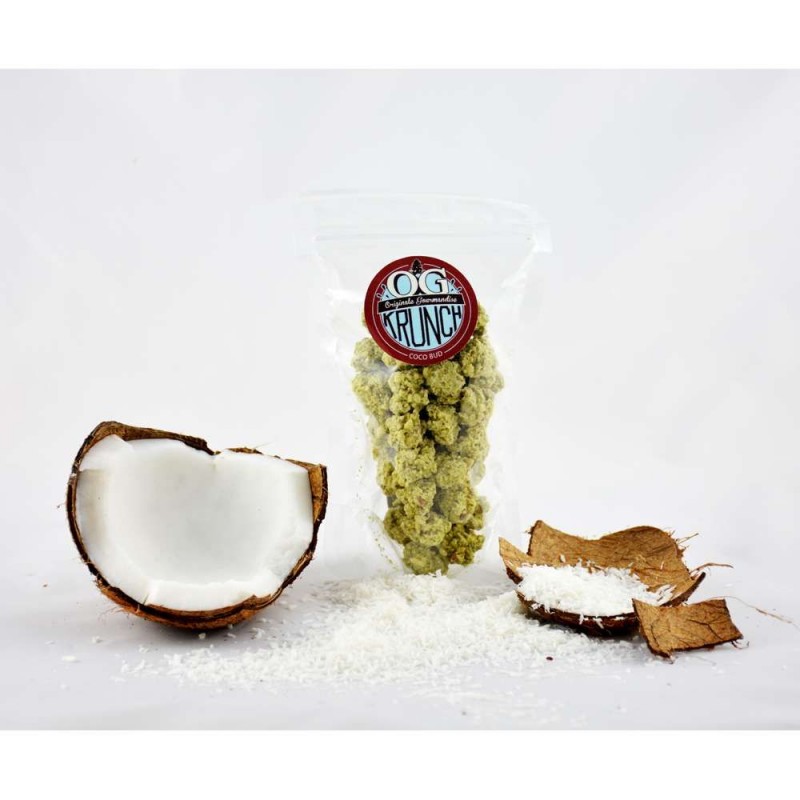 Les chocolats Coco Bud sont des sucreries croquantes élaborées à base de chocolat blanc, de riz soufflé, de thé matcha et de coco fraîchement râpée. Leur saveur de noix de coco et leur aspect, ressemblant fortement à celui d’une tête de cannabis, sont plus que réussis.